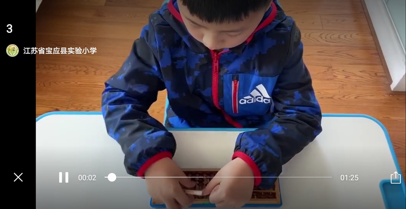 由于疫情,各校都实行推迟开学返校,开展线上教学。一年级数学内容家长或多或少的可以辅导孩子,但珠心算的拨珠方法家长基本不会,如何保证学生“宅”家进行拨珠训练,宝应实小教研组进行了慎重的研究。没有珠心算教材,他们就利用网络资源把珠心算电子教材和配套课件发给家长,让他们先进行自学,再把相关的内容做成微课或微视频让孩子们学习。