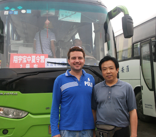 颜书记(右)与外教RAYMOND在2号大巴车前合影