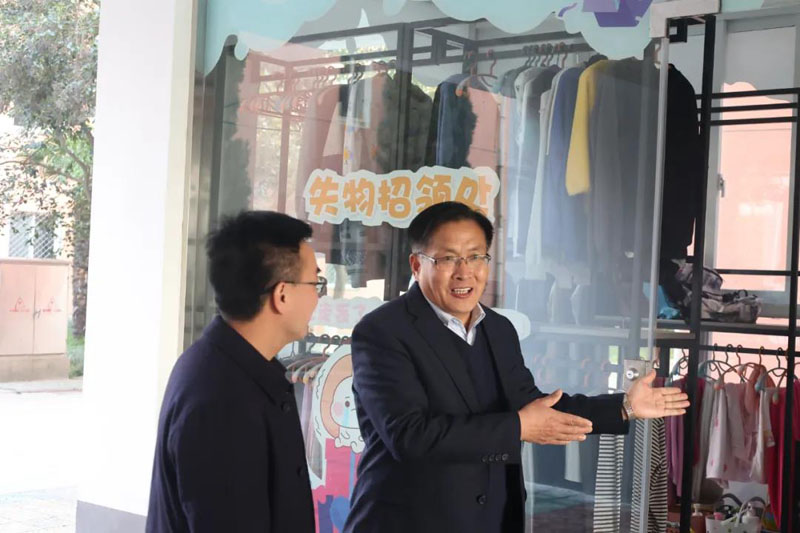 生活区的一处玻璃房里挂放了很多衣物,陈列得像个展厅,访问团疑惑不解。傅总连忙解释道,曙光留守儿童比较多,生活起居都在校园里,为了让孩子们及时领回自己丢失的衣物,我们特地将这些衣服清洗,晾晒整齐地展示在这里,方便孩子们领取。每个星期我们还通过视频展示招领室的陈列,帮助孩子们寻找自己丢失的物品。傅校长补充道,其实打造这样一个空间也是想通过现场的实境体验,引导孩子们学会整理好自己的生活空间。