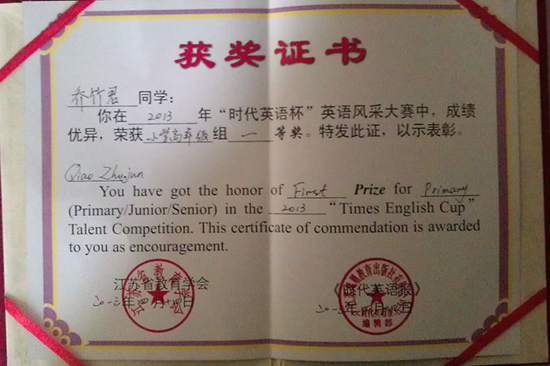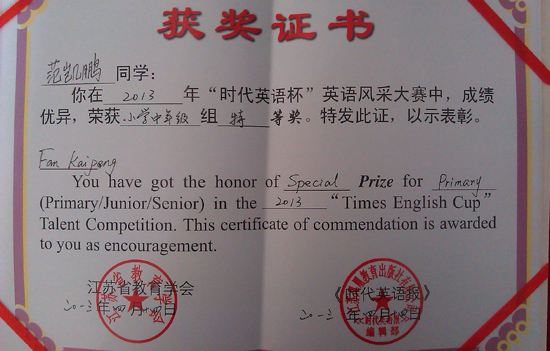 4月14日,由江苏省教育学会和《时代英语报》在南京共同举办的第八届“时代英语杯”小学生英语风采大赛总决赛中,淮安曙光双语学校小学部范凯鹏、乔竹君两位同学分别获得了中年级组特等奖、高年级组一等奖。这是曙光学子继去年第七届大赛中勇夺桂冠后又一次获此殊荣。