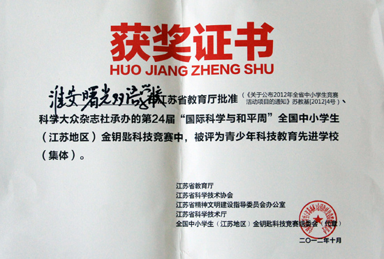 4月10日上午,淮安曙光双语学校小学部传来喜讯,在2012年10月由江苏省教育厅、江苏省科学技术协会、江苏省精神文明建设指导委员会办公室、江苏省科学技术厅共同举办,《科学大众》杂志社承办的第24届“国际科学与和平周”全国中小学生(江苏赛区)“金钥匙”科技竞赛中,成绩优异,被评为“江苏省青少年科技教育先进学校(集体)”,张少泽、阚仁林等10名学生分获特、一、二等奖。(吴廷山)