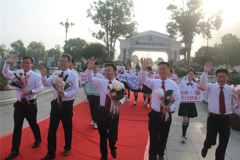 早上6时许,翔宇教育集团常务副总校长、淮安总校校长、淮安外国语学校校长高立顺、淮安外国语学校常务校长曹国柱及校务委员会全体领导来到红毯两边,为学校老师送上鲜花和祝福。