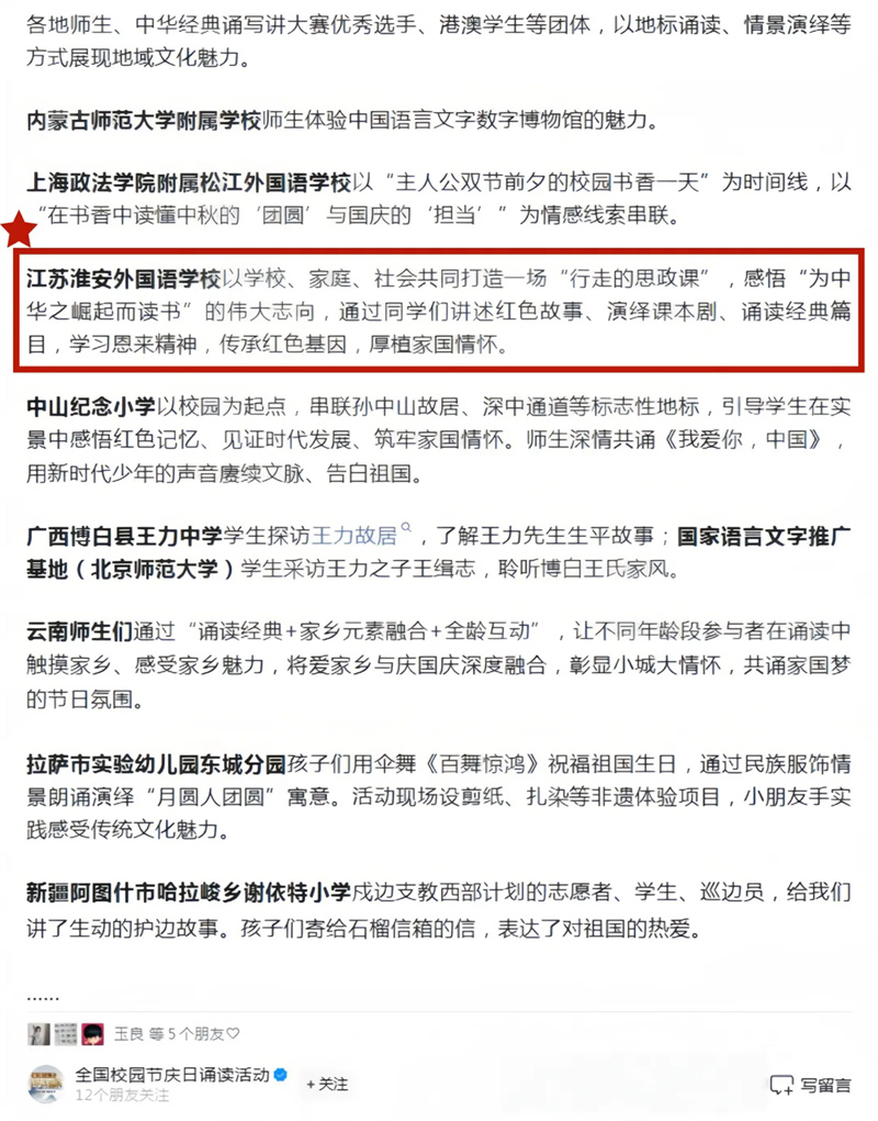 淮安外国语学校作为江苏省品牌特色学校代表、淮安市唯一一所学校荣登中国教育电视台《典耀中华》专题直播节目。淮外师生展示“学周”风采,以声传情、以诵聚力,告白伟大的祖国。