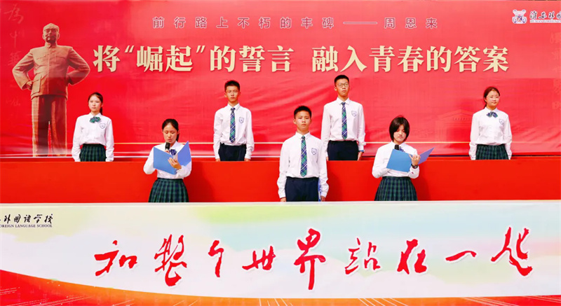 周恩来总理是淮外师生心中最耀眼的启明星和精神偶像。“以少年恩来作典范,为中华崛起而读书”,是淮外的校训,“学周”是淮外的德育特色主题。同时,淮外将思政小课堂与社会大课堂深度融合。组织师生走近多地的场馆开展行走的思政课,打造“沉浸式”学习场景,让场馆变课堂、让文物成教材,让精神成为学子奋进的动力。