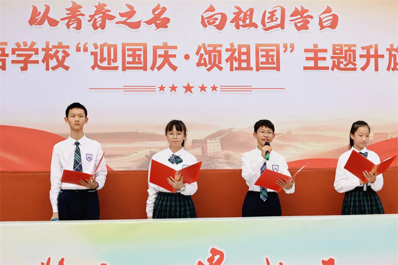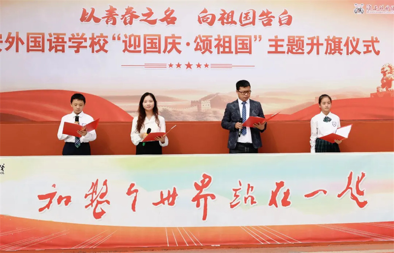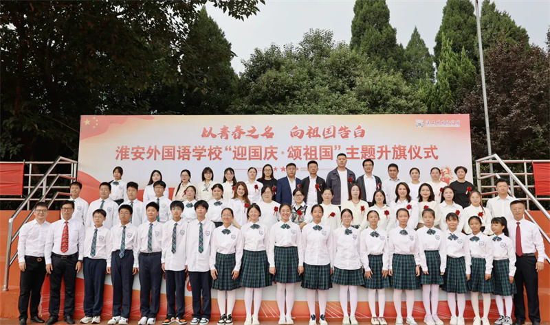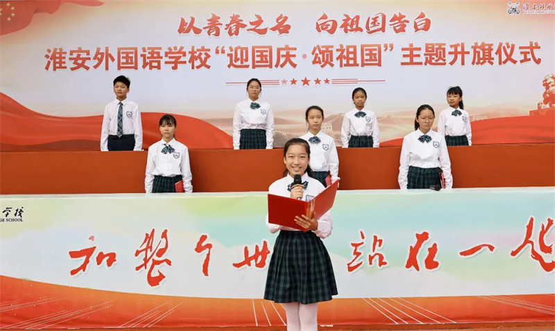 9月30日上午,全体师生齐聚运动场,开展“迎国庆 颂祖国”主题升旗仪式活动。这是一次与祖国的对话,是一段独具淮外记忆的告白。