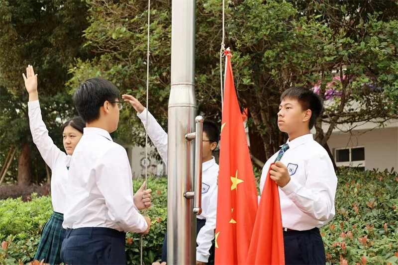 奏唱国歌,汇聚青春之力。国歌声中,国旗冉冉升起。晨光中,那一片中国红映照在每一位师生心间。身板挺直、拳头紧握、目光直视,心中的热爱与自豪油然而生。