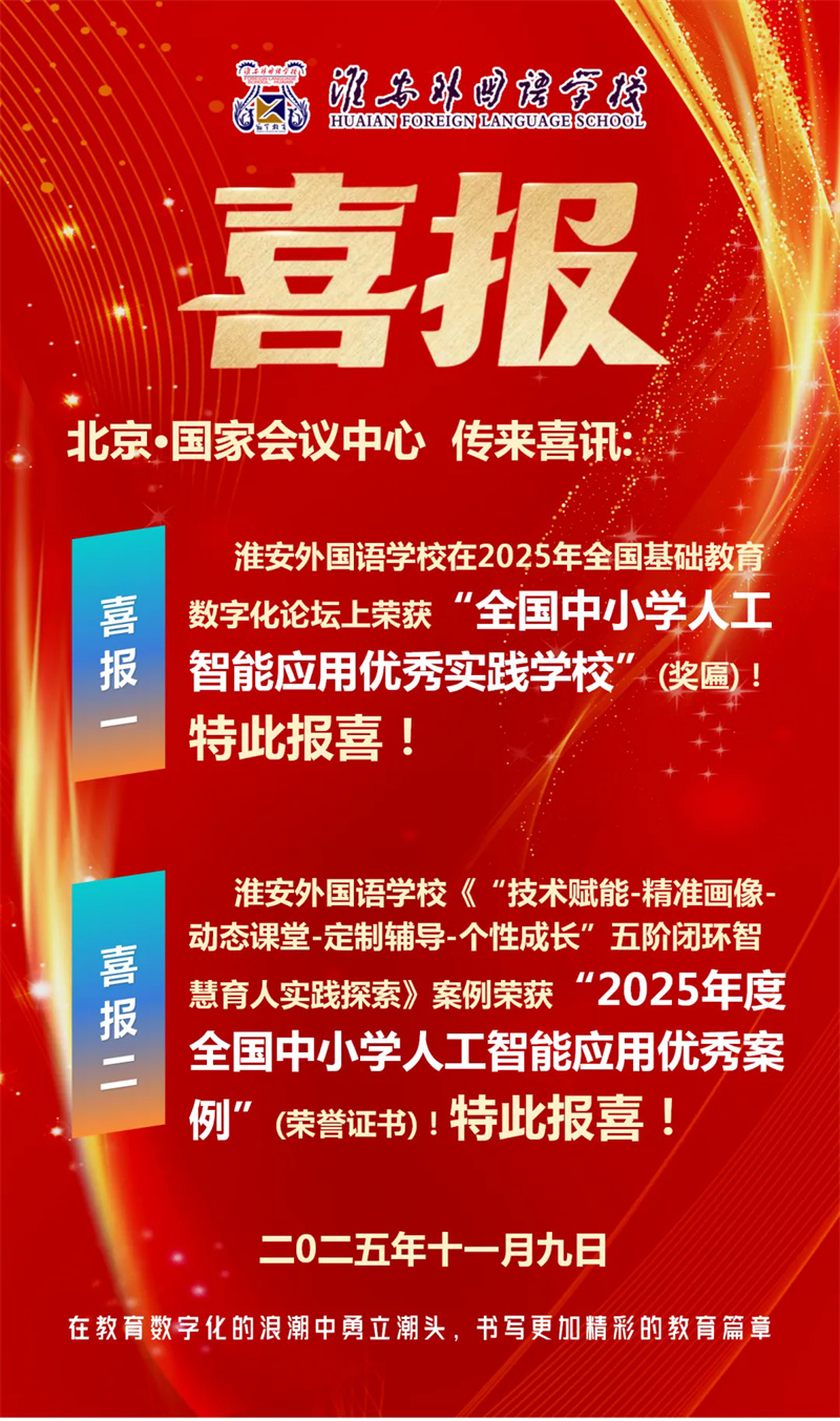 此次获奖不仅彰显了淮外在智慧教育领域的领先探索,更激励着全校师生继续秉持创新精神,在教育数字化的浪潮中勇立潮头,书写更加精彩的教育篇章。
