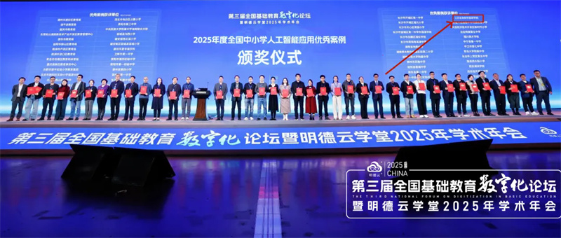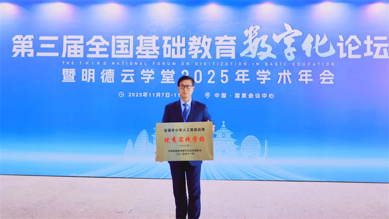 论坛以“人工智能时代,中小学如何应对”为主题,汇聚全国教育界专家、名校代表共话数字化转型路径。经过申报、筛选、评审,淮安外国语学校凭借扎实的应用实践与显著成效,获评“全国中小学人工智能应用优秀实践学校”,赵树青校长现场获颁荣誉奖匾。