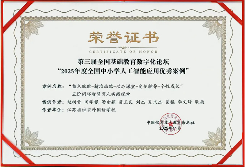 同时,淮外申报的《“技术赋能-精准画像-动态课堂-定制辅导-个性成长”五阶闭环智慧育人实践探索》案例,因创新性、实用性和推广价值突出,被评为“2025年度全国中小学人工智能应用优秀案例”,喜获荣誉证书。学校的实践案例,将技术赋能贯穿教育教学全流程,通过精准画像把握学生特点,以动态课堂优化教学过程,用定制辅导补齐成长短板,最终实现学生个性成长,得到评审专家的高度认可。