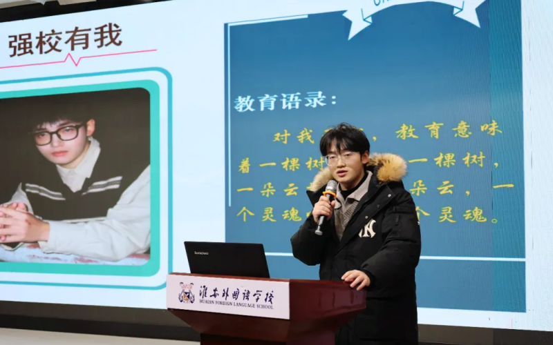 初一年级刘儒豪老师带来的《强国有我》主题演讲慷慨激昂。他结合自身教育实践,真诚感谢学校给予的帮助和鼓励。在演讲中,他深情引用了教育箴言:“教育意味着一棵树摇动另一棵树,一朵云推动另一朵云,一个灵魂唤醒另一个灵魂”,深刻阐释了教育的本质和教师的使命,唤醒了大家对教育初心的思考。