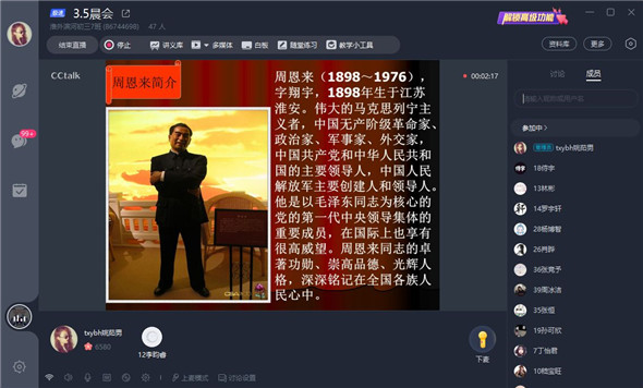 随后,同学们在线上积极讨论如何传承恩来精神。同学们表示要认真学习周总理积极进取、刻苦好学、甘当公仆、无私奉献的精神,树立崇高理想,以“为中华之腾飞”为己任。特别是在疫情期间,更应该学习周总理“严于律己”的精神,自律自强,奋发向上,努力学习,成为一个有利于人民,服务于社会,贡献与国家的新时期优秀人才。