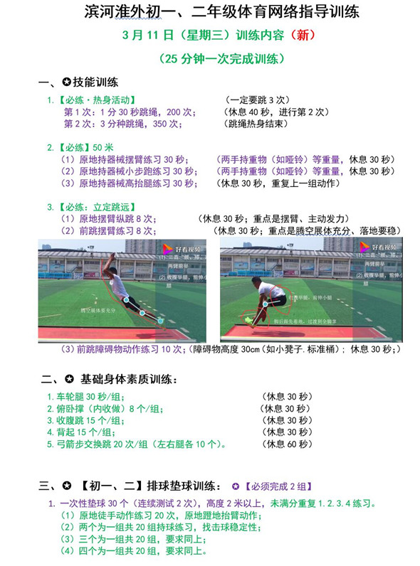 好的身体是学习的重要前提,滨河淮外一直注重学生们的体育锻炼,在这个特殊时期也不例外,在安排学生们在上课的同时,把大课间的运动时间单独划分出来,让同学们有足够的运动时间,体育老师们也纷纷大显身手,为孩子们制定每天的运动计划,并及时发送到各班级,尽心尽职的检查每一位同学的宅家锻炼计划。