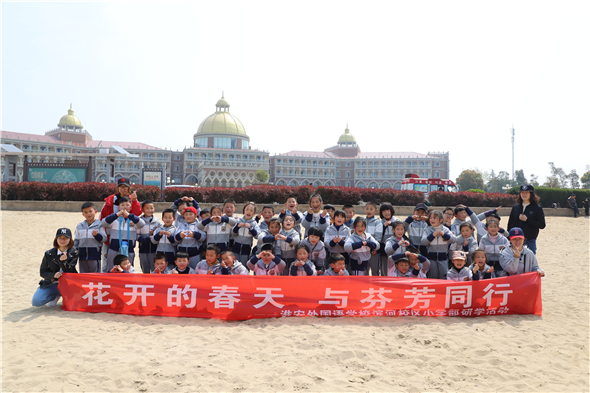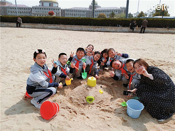 在老师们的带领下,低年级的孩子们很快到达了研学的第一站,素有“苏北小三亚”之称的骆马湖银滩。小朋友们迫不及待地冲向这片洁白细腻的沙滩,在沙滩上,同学们拎着小桶,拿着铲子,挖啊、挖啊,一阵翻腾后,沙子被堆成了各种造型:抽象派的热狗、迷你版的冰激凌、漂亮的城堡……整个沙滩荡漾着孩子们的欢声笑语。