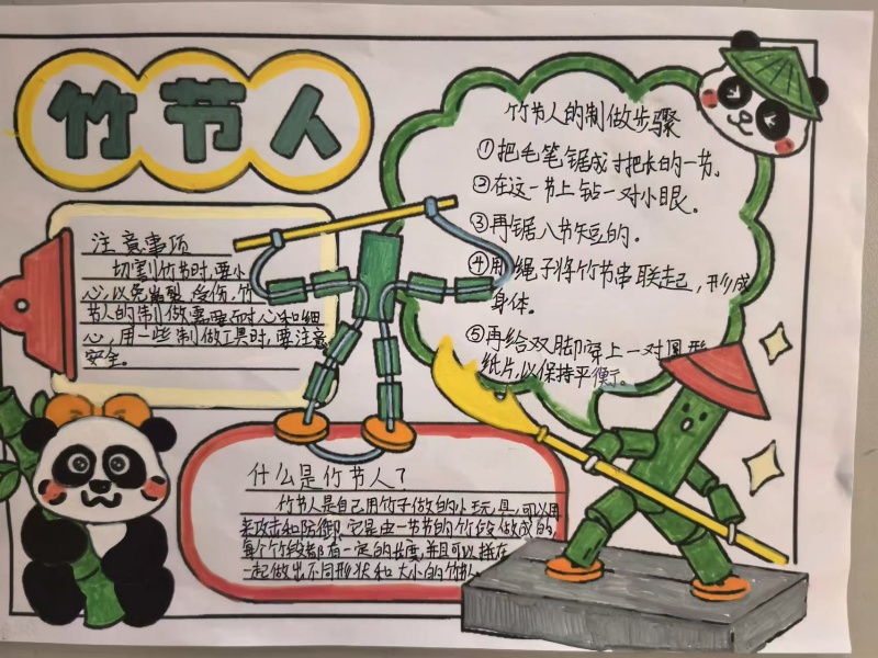 根据制作指南,同学们利用闲余时间,亲手制作竹节人。这些竹节人各具特色:有的高大威猛,有的小巧玲珑,有的气宇轩昂……同学们精心挑选材料,为竹节人制作独特的装饰,一个个栩栩如生的竹节人在同学们的巧手下诞生。