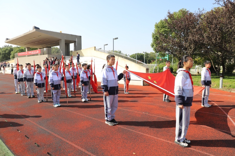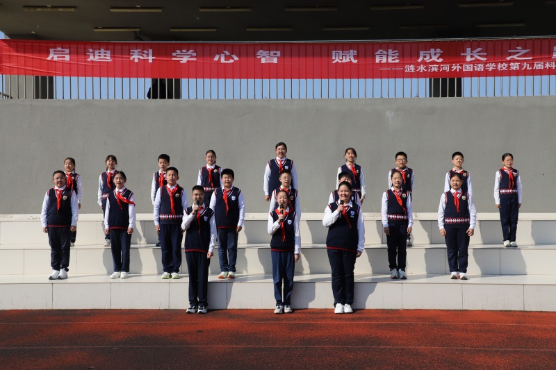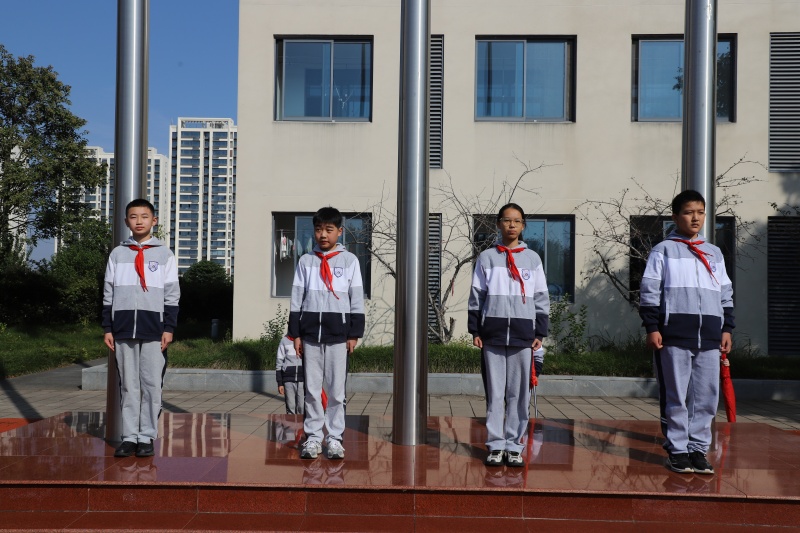 队员邹宇辰、嵇可人担任本次升旗仪式的主持人。护旗手胡宸、薛雨泽、李程曦、陆跃文等同学护送国旗庄严进场,伴随激昂雄壮的国歌声,鲜艳的五星红旗冉冉升起,滨河淮外小学部全体师生敬礼,嘹亮的国歌声响彻滨河淮外的校园,激荡的旋律回荡在每个人的心底。