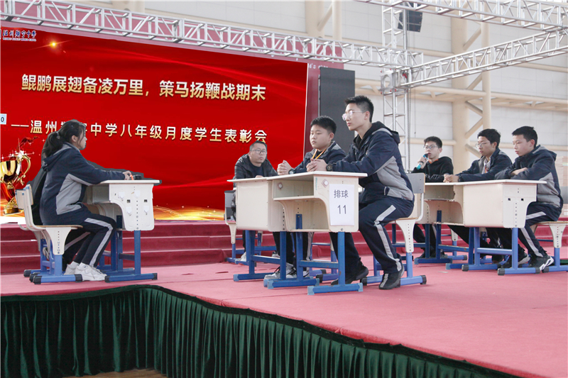 表彰先进,激励全体。分管校长王灌南、年级副主任周耀耀分别为“翔宇之星”“班级领跑人”“文化优胜班集体”“数学、科学素养竞赛获得者”等个人和集体奖获奖者颁奖。王校长鼓励同学们努力学习,争取下一次看到更多的同学上台领奖。颁奖结束后,年级部副主任周耀耀强调,距离期末统考仅有27天,并为学生准备了备考锦囊:高效利用课堂,查漏补缺、夯实基础,培优提高、巧用时间,弯道超车。