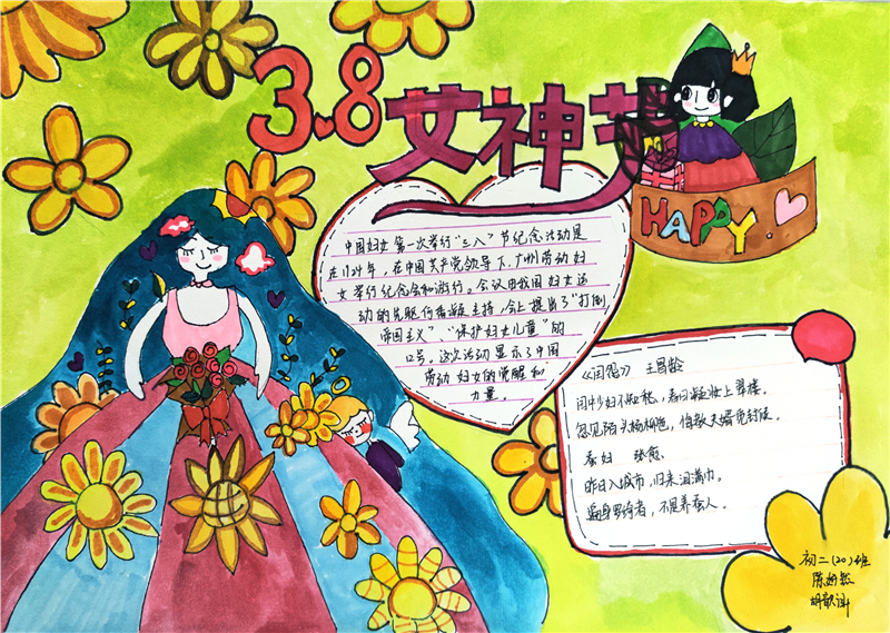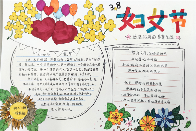 三月,春风和煦,春暖人间。2021年3月8日,温州翔宇中学初中部学生张舒研、胡雯雯等同学在美术教师谢芳的指导下,绘制了一幅幅精美的手抄报,利用“三八国际妇女节”的契机,向自己的母亲表白。