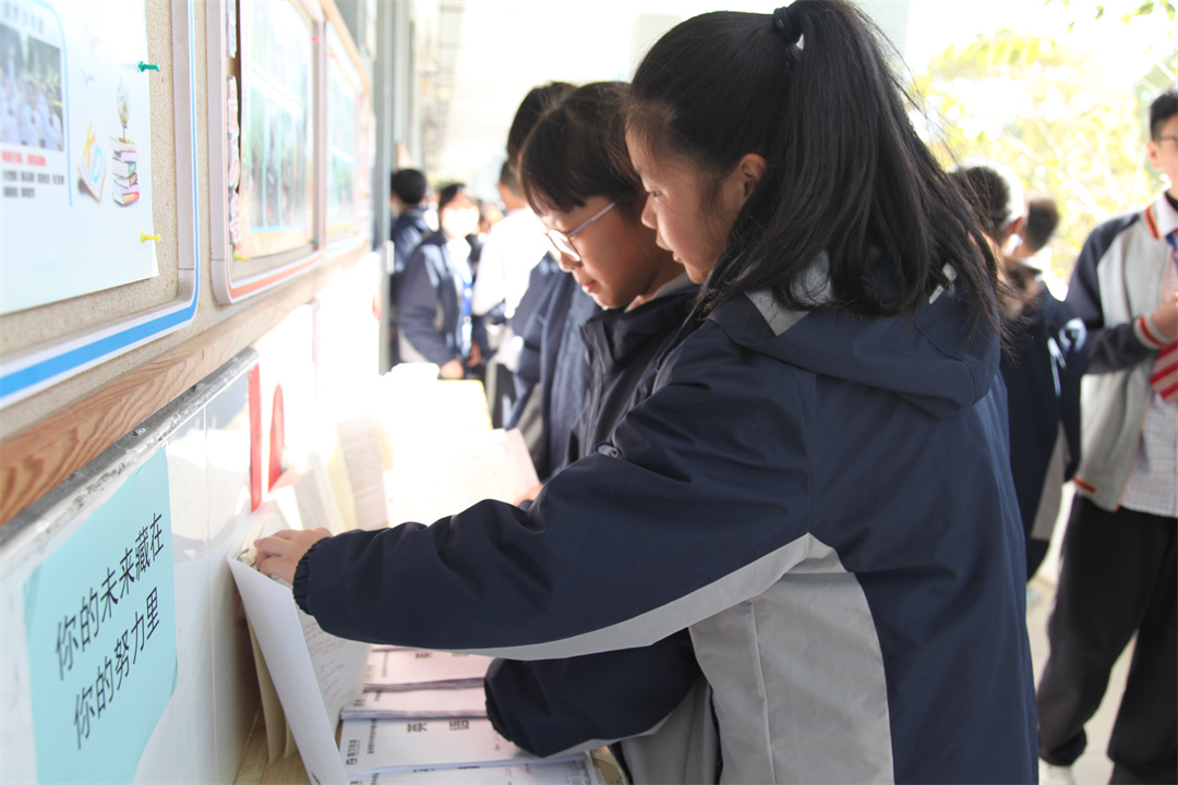 2023年12月8日上午,温州翔宇中学七年级开展优秀作业展活动,途经七年级走廊区域,桌子上整齐摆放着各班各科优秀作业本、优秀导学案、优秀错题本等,待下课铃声响起,同一年级学生可相互观展、翻阅、借鉴。