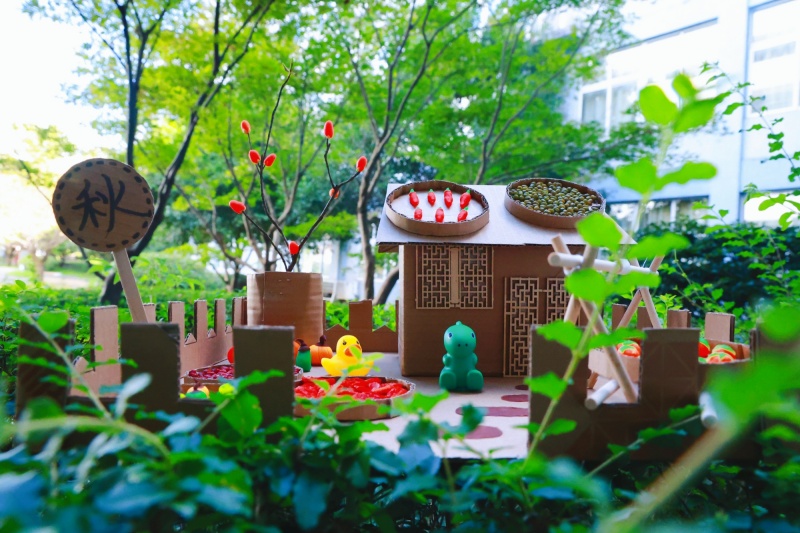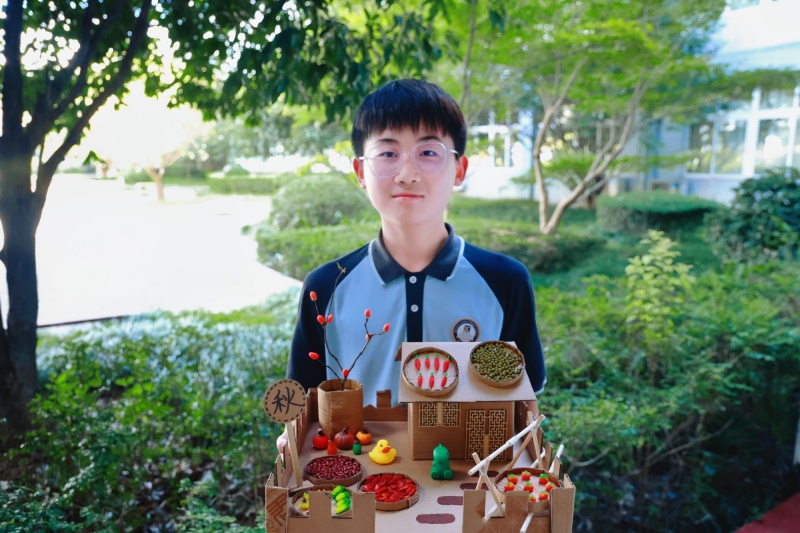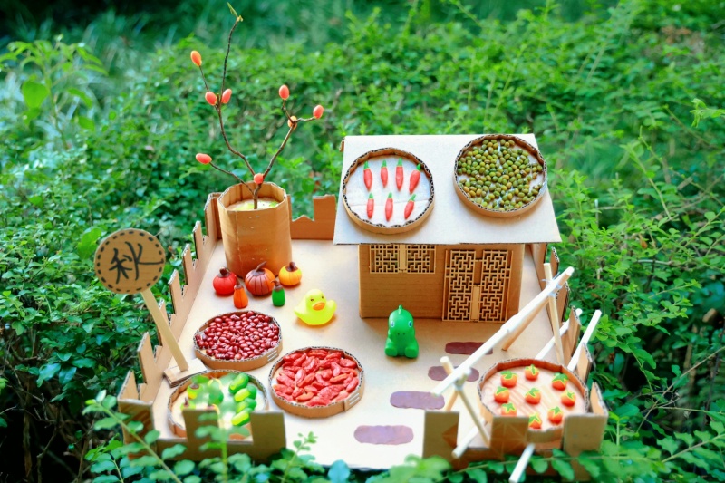 晒秋手作是朱柏特同学创作的,他介绍,该作品取材于楠溪江“晒秋”习俗,借用红豆、绿豆、枸杞等食材真实呈现丰收景象,柿子、胡萝卜等蔬果则用橡皮泥精心捏制,纸板搭建的房屋结构细致入微,生动再现了家乡秋日风情。