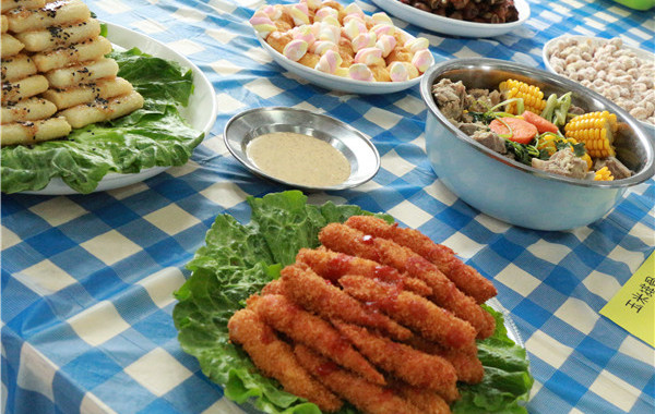 接下来就是品尝美食的时间了。看!有家长带来的自制南瓜饼,有造型各异的海鲜拼盘,被孩子们一抢而光的炸鸡腿……大家一边品尝,一边拍照分享。