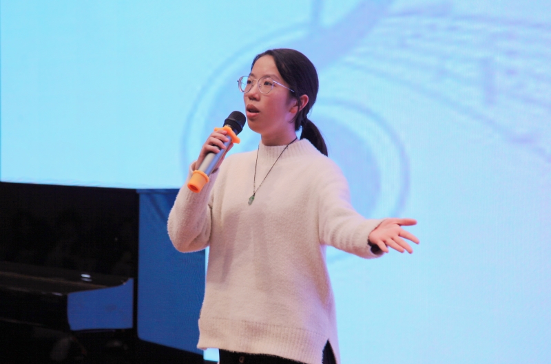 高一年级40多名学生依次上场演唱一首能代表自己水准的歌曲。音乐教师郑圣敏、叶启启两位老师担任专业评委,逐一给选手评分。