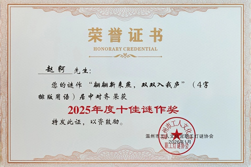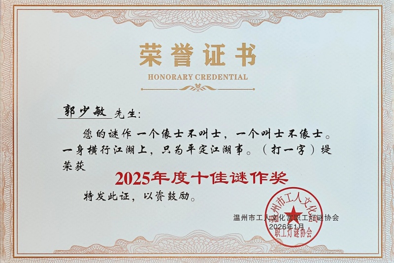 2026年1月25日,温州市工人文化宫职工灯谜协会“谜韵流光,同心致远”年会在文化宫四楼国学馆举行。温州翔宇中学翔宇中华灯谜馆馆长、知名谜家郭少敏应邀出席,并在紧张激烈的电控竞猜环节中发挥出色,一举夺魁,荣获一等奖。