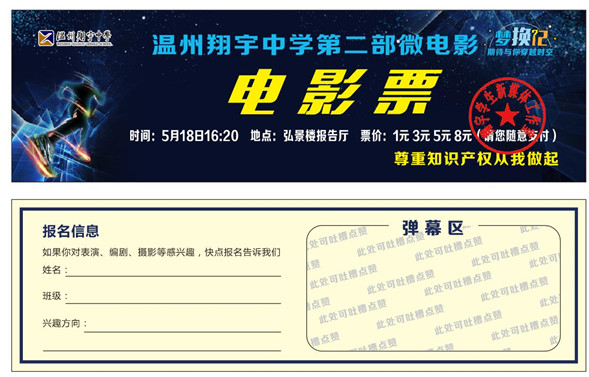 票价归团队,尊重知识产权从我做起。《梦换记》是由翔宇新闻中心、温州翔宇中学初中部、翔宇学生新媒体工作室联合制作,“虽然我们的微电影还处于起步阶段,十分业余,但孩子们能够在参与中体验到商业运作模式,享受到劳动付出的回报,这让他们很开心,原创作品需购票观看,也是培育学生尊重知识产权的意识。”翔宇学生新媒体工作室负责老师介绍,本次票款用途将分两部分,一部分将支付电影团队报酬,包括编剧、演员、主题曲演唱者等,另一部分将存于翔宇学生新媒体工作室财务部,用于下一部微电影的筹备费用。