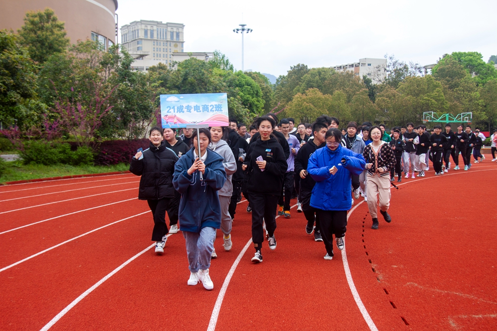 祁欧秀、吕修军、邵晓荷和全体成专学生一起跑步。