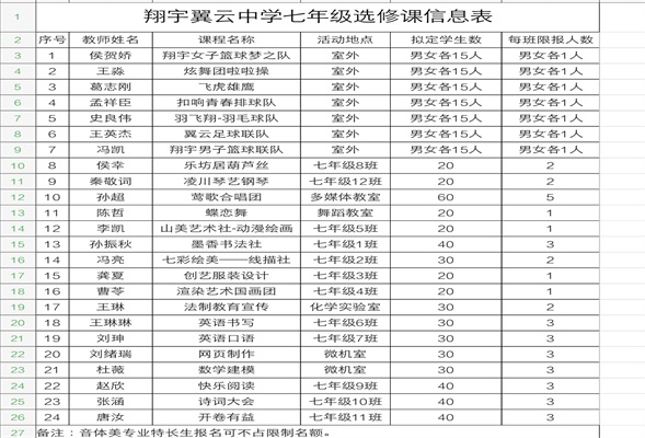 为丰富学生课余生活、提高学生综合素质、全面推进校园文化建设,枣庄翔宇翼云中学七年级“自主选修、快乐成长”主题选修课程于9月20日下午课外活动正式启动。课程包括室内课程与室外课程,共24类。其中,室内课程设有书法、葫芦丝、钢琴、舞蹈、绘画、阅读等,室外课程设有足球、篮球、羽毛球、田径、跳绳等。选修课程一经公布,受到了广大同学的热烈追捧,学生根据自己的兴趣爱好,突破班级界限,“自助餐”式选课,参与度空前高涨。七年级分管校长杨平、年级主任吴进东、艺体主任汤开云、主任助理李阁深入各个授课地点,对选修课的开展进行了实地考察,对师生们的精彩表现给予了高度评价。