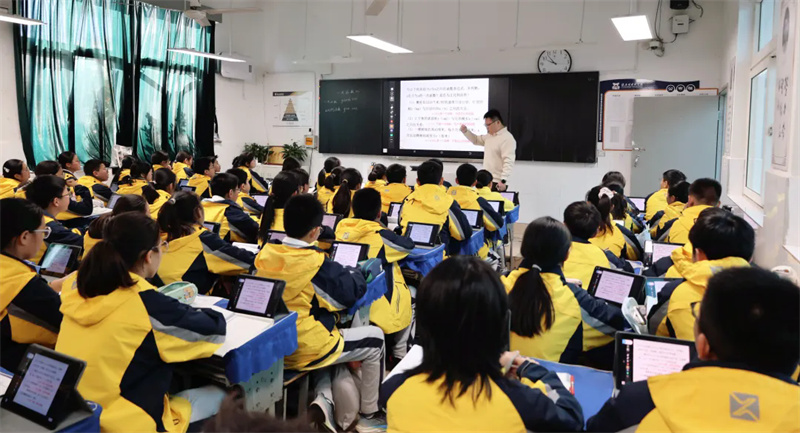 肖春凯老师在初二(1)班面向来宾开设一节数学课。各位来宾在教室中了解淮外“三环三案”智慧课堂呈现方式。