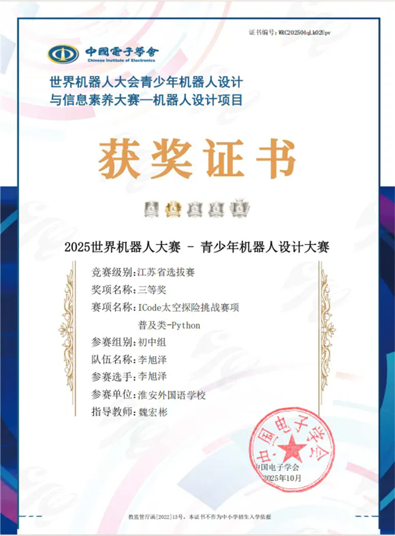 晚秋的淮外校园生意盎然,捷报频传。在刚刚落幕的2025世界机器人大赛江苏省选拔赛(ICode太空探险挑战赛)中,淮安外国语学校学子表现突出,斩获优异成绩。根据大赛通知文件中奖项比例计算,淮外共有12名同学获奖,其中有2名同学荣获省一等奖,7人获省二等奖,3人获省三等奖。获奖层次和获奖人数均居淮安市初中第一。