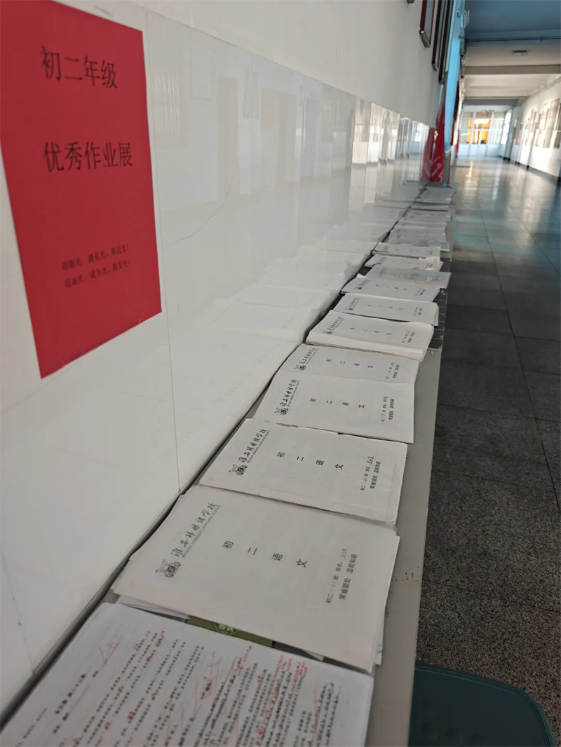 展台上,语文作业文采飞扬、见解独到;数学答题步骤清晰、逻辑严密;英语书写流畅优美、语法准确;物理作图绘制精细、标注严谨;还有如同作业纸般工整的草稿本……每一页纸都记录着同学们踏实的学习足迹,每一个批改痕迹都凝聚着老师的悉心指导。