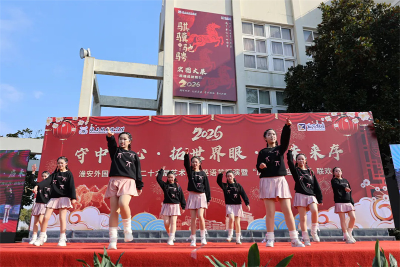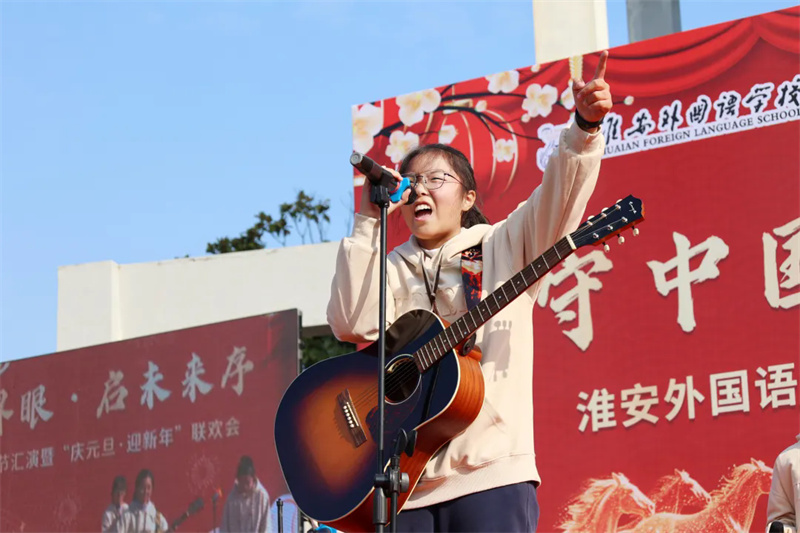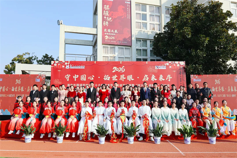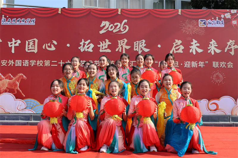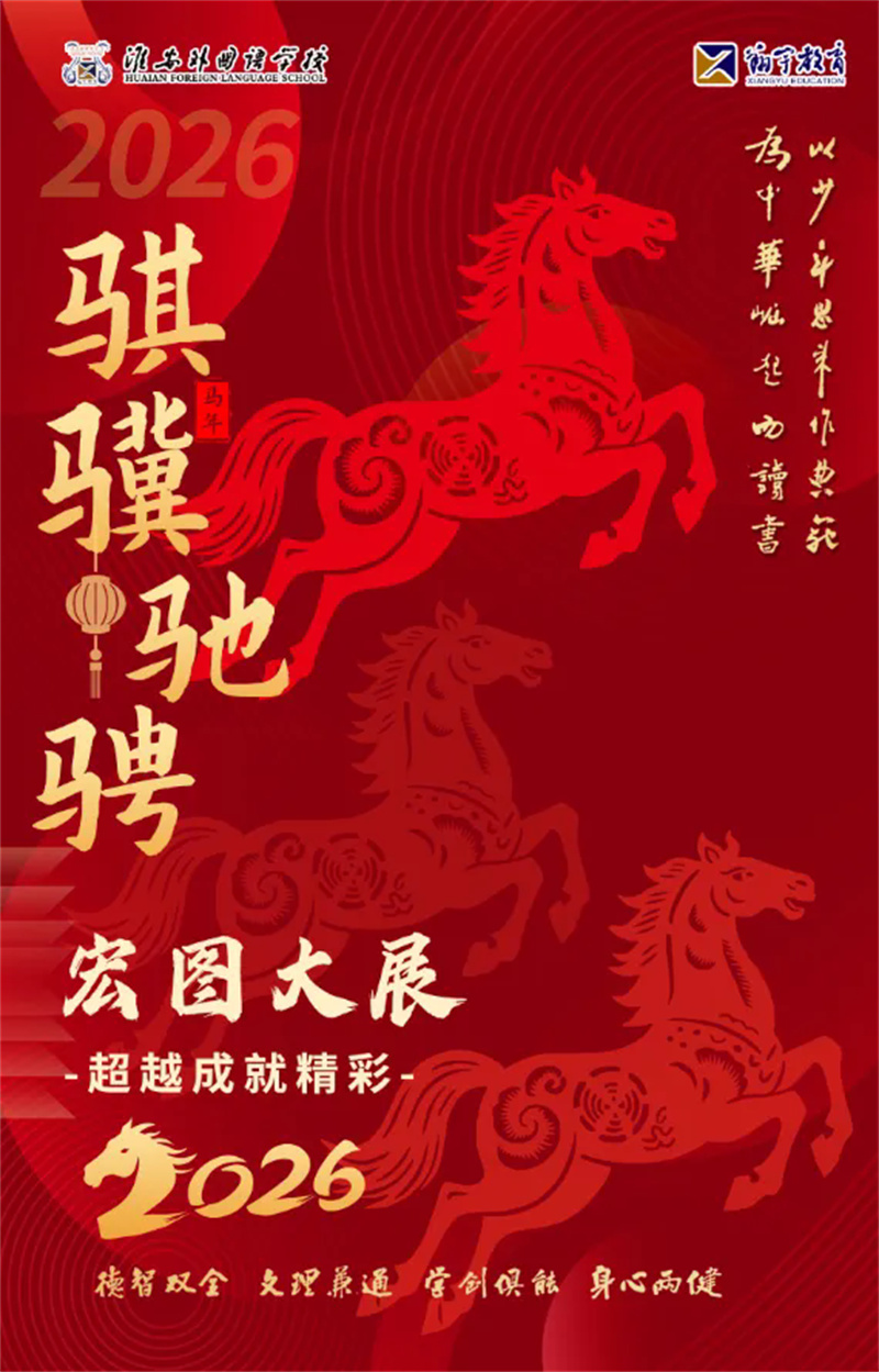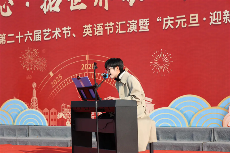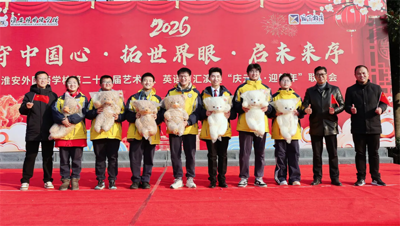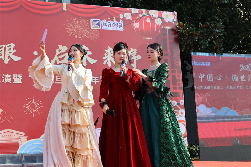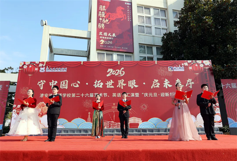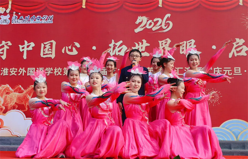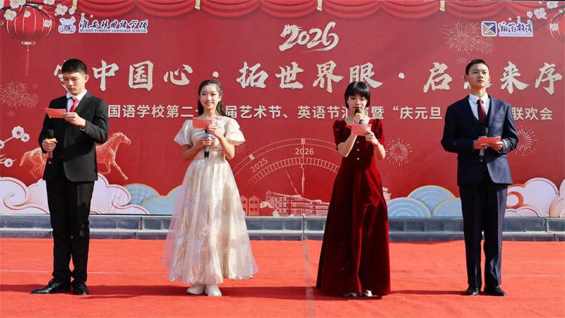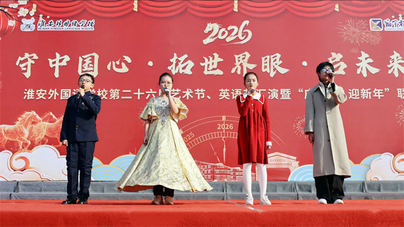 12月27日午后,暖阳倾洒,淮安外国语学校运动场上一片欢腾。彩旗招展,乐声回荡,学校第26届艺术节、英语节汇演暨“庆元旦·迎新年”联欢会在冬日晴空下活力启幕。本次活动以“守中国心、拓世界眼、启未来序”为主题,融传统韵味、时代气息与国际视野于一体,以青春之名,唱响新年序曲。淮安外国语学校校长赵树青及校务会成员全程参加活动,本次演出由初三(5)班高妍汐、初三(4)班杨洪懿、初三(11)班戴梓歆、初三(5)班刘峻希联袂主持。