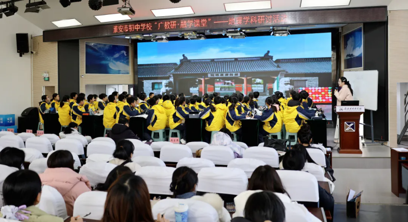12月26日下午,淮安市初中学校“广教研·融学课堂”地理学科研讨活动在淮安外国语学校成功举办。淮安市教研室初中地理教研员李靖老师、各县区地理教研员、市直属学校地理教研组长、各初中学校地理教研组长、备课组长及地理教师代表参与活动。活动包括课堂教学观摩与评课研讨两大环节,由淮外地理学科组长李强主持。