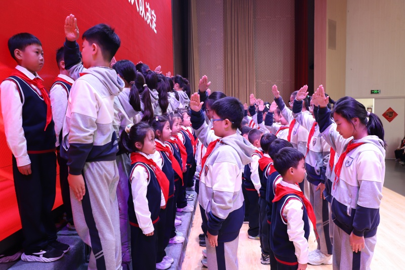 六年级优秀队员代表朱梓桐站在队旗下,带领全体新队员高举右拳,庄严宣誓:“我是中国少年先锋队队员,我在队旗下宣誓:我热爱中国共产党,热爱祖国,热爱人民,好好学习,好好锻炼,准备着:为共产主义事业贡献力量!”铿锵的誓言回荡在校园,定格成少年们对理想信念的郑重承诺。