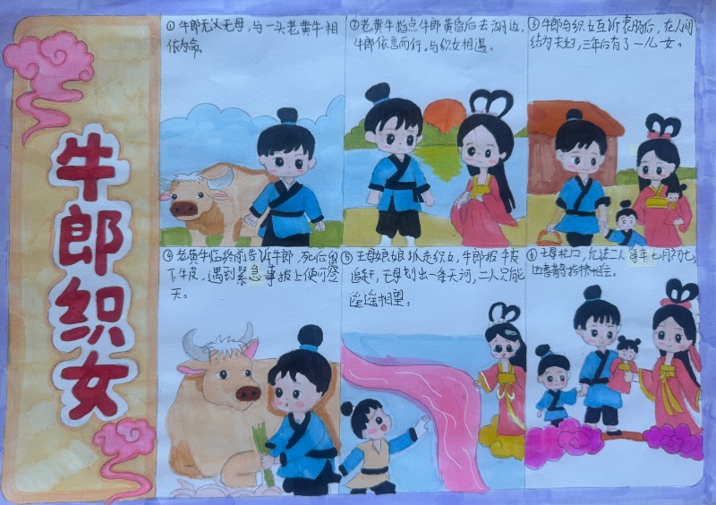 在老师的指导下,同学们化身“小小创作者”,笔下的连环画充满童真与巧思。每一幅作品都紧扣民间故事的核心,画面连贯、情节清晰,色彩艳丽,仿佛将文字里的故事直接“搬”到了纸上。