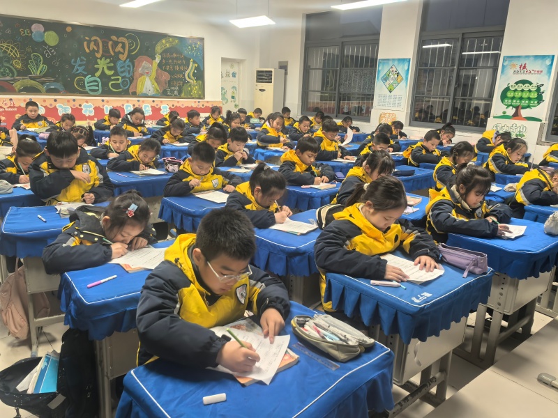 笔试环节则是一场专注力的较量。孩子们低头伏案,笔尖在纸上沙沙作响。他们认真书写每一个字母,仔细完成每一道题目,工整的字迹、专注的神情,都是努力的最好证明。这一刻,安静的教室成了他们展示实力的小舞台。