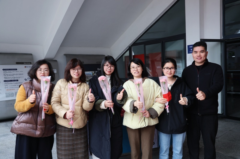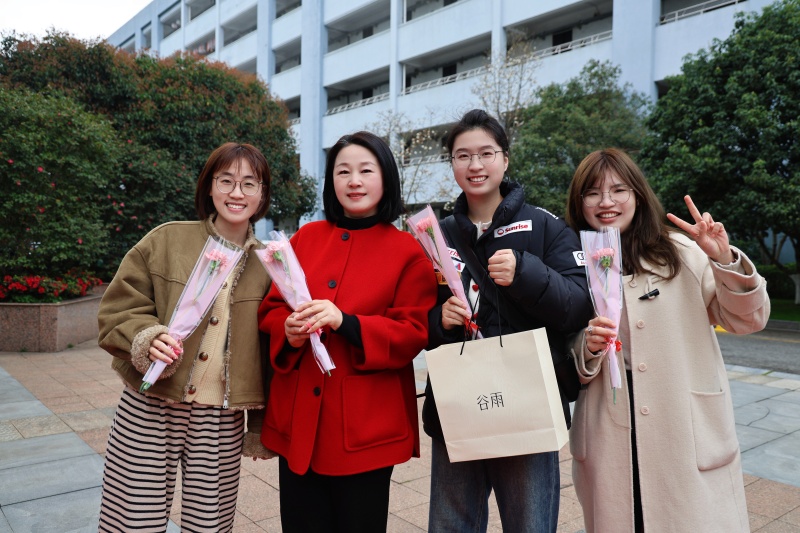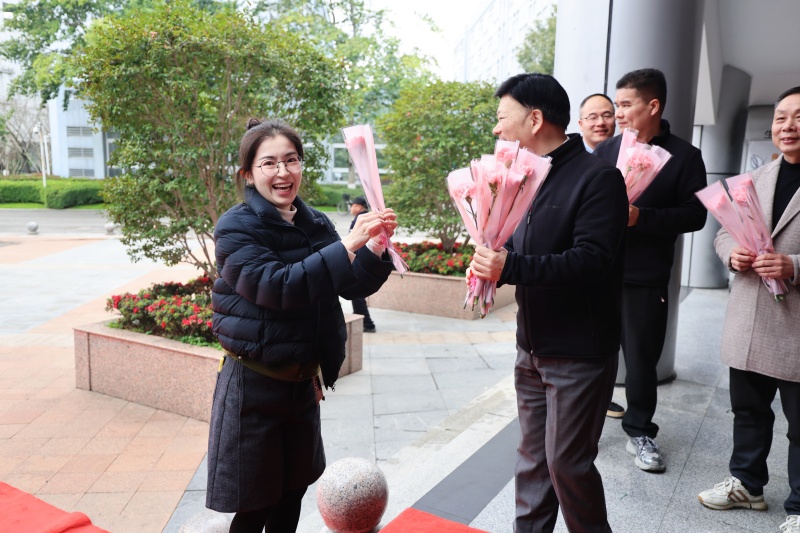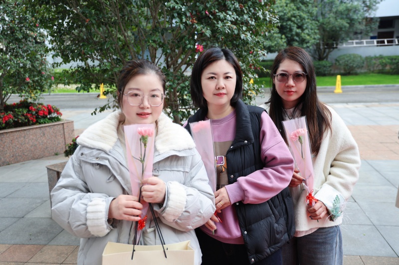 集团和学校领导高立顺、朱加丰、湛晶、董静、高谋、栾鸾等以及各学部行政领导早早守候在这里,手捧鲜花,为每一位女教职工送上节日的祝福。