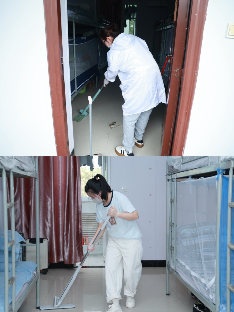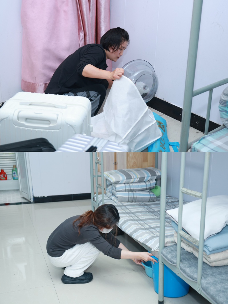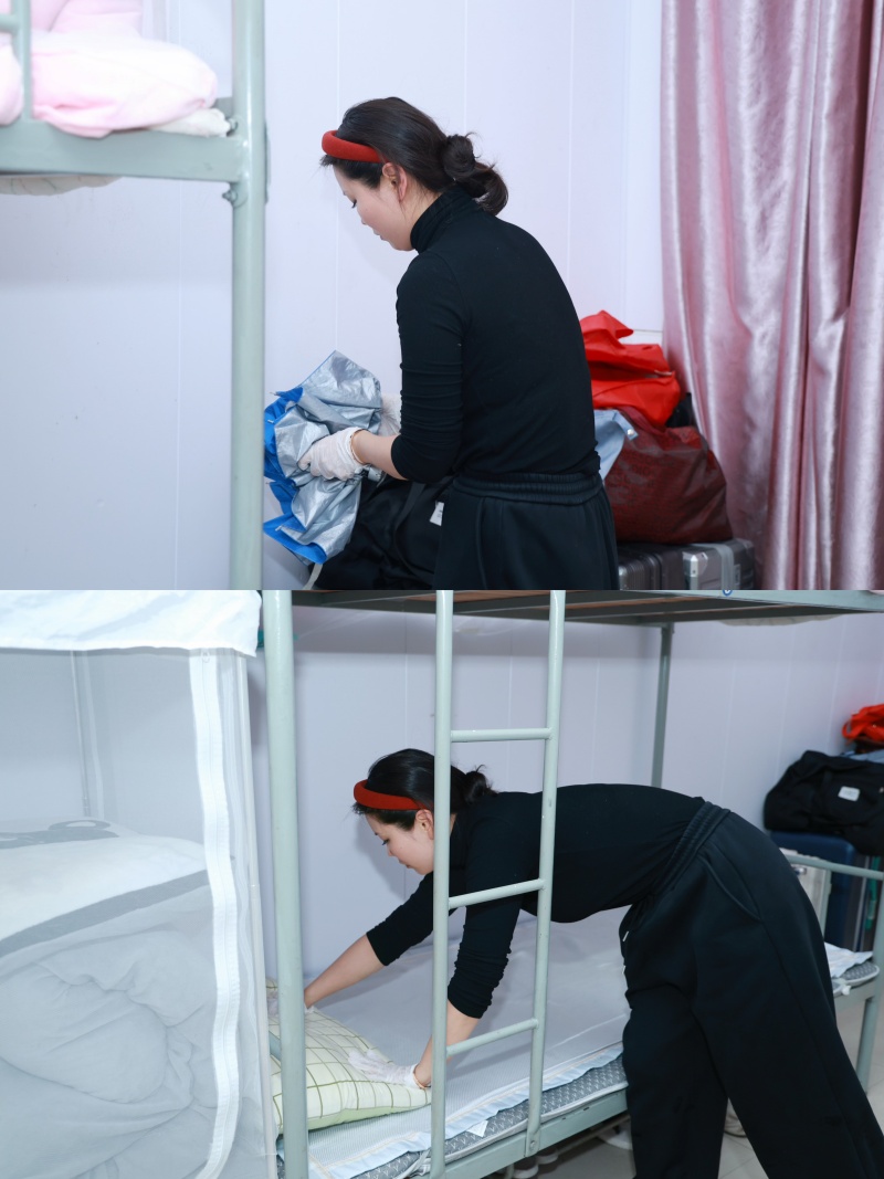 13:50,老师们准时到场集合、抽签。随着一声口令,14:00比赛正式开始——铺床单、叠被子、摆物品、清死角……老师们动作利落、有条不紊,仿佛开启了“倍速模式”。30分钟后,一间间原本“素面朝天”的宿舍变得整齐划一:被子棱角分明,洗漱用品排成一条直线,地面光可鉴人。