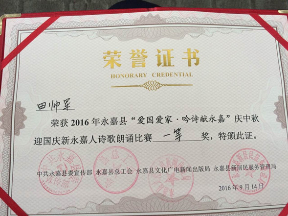 2016年9月14日下午,由中共永嘉县委宣传部等部门联合举办的“爱国爱家·吟诗献永嘉”庆中秋迎国庆新永嘉人诗歌朗诵比赛成绩揭晓,温州翔宇中学田帅军老师、苏红梅老师分获大赛一、二等奖。其原创作品《今天,我从永嘉醒来》和《醉美永嘉》赢得了在场观众热烈地掌声。