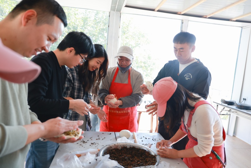 活动的第一篇章,由指尖流淌的面香开启。永嘉麦饼DIY环节,大家巧手翻飞,专注于擀压面皮、包裹馅料的专注之乐。梅干菜的醇厚与咸菜的咸香在空气中交织,当金黄的饼胚在烤制中飘散出诱人香气,一场味蕾的欢宴随即上演。“尝尝我的手艺!”“你做的真不错!”老师们相互分享着劳动成果,小小的麦饼瞬间化作温暖的媒介,暖了胃,更暖了彼此的心田。