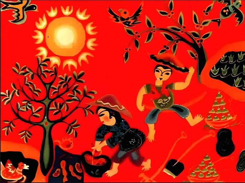 造型表现上,博里农民画多采用夸张变形手法,不拘泥于现实比例,使形象更具趣味性和表现力。如把人物的身体画得更加粗壮结实,突出劳动者的力量感;把动物的形态画得憨态可掬。