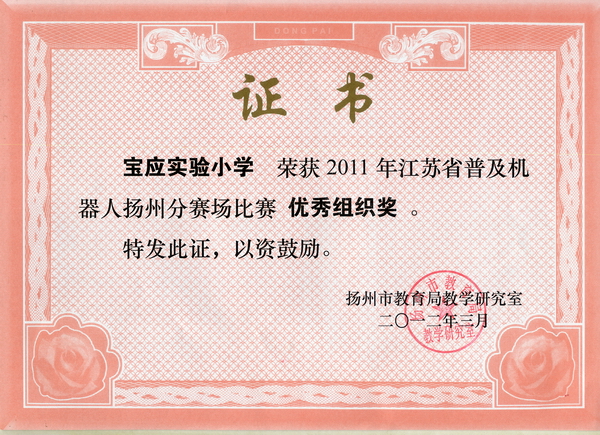 近日,从省市相关教育部门传来好消息:在2011年底举行的省青少年普及机器人比赛中,宝应县实验小学电脑机器人兴趣小组学生在比赛中沉着冷静,团结协作,发挥出色,共取得一等奖2名,二等奖8名的好成绩,学校还荣获“江苏省青少年普及机器人竞赛优秀学校团体”、“扬州市普及机器人比赛团体一等奖”、“江苏省普及机器人扬州分赛场比赛优秀组织奖”等称号,综合成绩在扬州所有参赛小学中领先,得到了上级主管部门的高度评价。