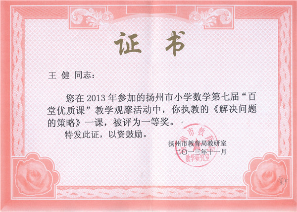 近日,扬州市小学数学第七届“百堂优质课”评比结果揭晓,宝应实小王健老师喜获一等奖好成绩,宝应实小数学“学导式”教学模式再次在全市教学大赛中华丽绽放。