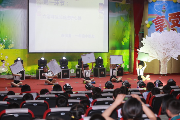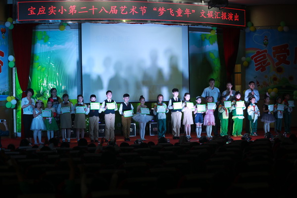 艺术点缀生活,文化丰富心灵。本届艺术节以“梦飞童年”为主题,充分展示了实小师生奋发向上、放飞梦想的精神风貌。宝应实小王楹著副校长代表学校对艺术节的成功举办表示热烈祝贺,并预祝汇报演出圆满成功。汇报演出在舞蹈《鸟》的欢庆气氛中拉开帷幕,节目形式丰富、精彩纷呈。有舞蹈、音诗画、歌表演、合唱等。舞蹈《月亮故事》、《江南》展现了孩子们的童心童趣;《爵士宝贝》展示了学生的热情与活力;舞蹈《戏童》表现了孩子们对中华传统戏曲文化的传承和发扬;珠心算《最强大脑表演秀》,孩子们的精彩表现可以说只能用“震撼”来形容,加减法听心算、乘除法看心算,难度系数越来越高,精彩迭起,赢得了观众热烈的掌声。艺术节最后在音诗画《阳光少年》的表演中落下帷幕。每年的艺术节,不仅组织了精品节目的展演,还有艺术类单项比赛。在汇报演出中,还对获得本届艺术节“银杏小歌手”、“银杏小舞星”、“银杏小演奏家”、“银杏书法之星”、“银杏绘画之星”近八十名学生进行了现场颁奖。
