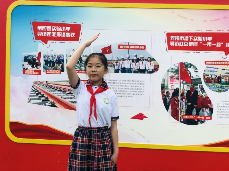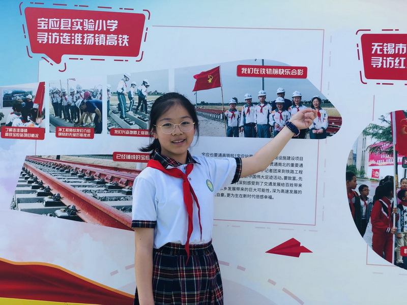 在“红领巾寻访新中国伟大足迹”展牌前,杨宥嘉怀着激动的心情,无比自豪地给郭文奇部长一行介绍了队员们寻访连淮杨镇高铁的情况。“郭伯伯好!大家好!我是宝应县小学少先队员杨宥嘉。我们寻访了江苏高质量发展新成就。我们宝应县实验小学小记者寻访了连淮扬镇高铁宝应段施工现场,看到了为高铁早日开通夜以继日奋战的劳动者;了解到钢轨的无缝对接技术能让乘客几乎听不到高铁运行的声音、感受不到震动。宝应站是连淮扬镇铁路在宝应境内设设置的站点,高铁开通后,宝应到扬州从一个半小时车程缩减到半小时,太便捷啦!……”