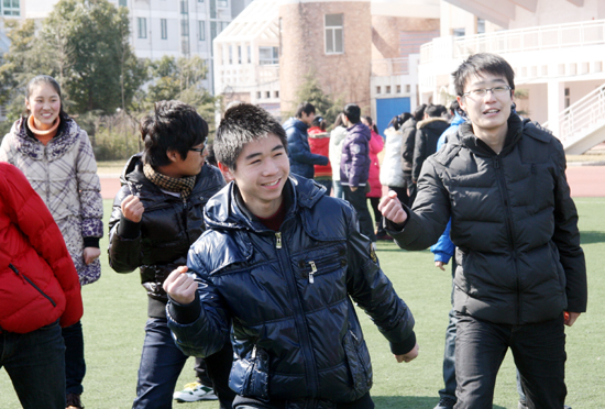 报告会后,拓展训练营的教练带领同学们来到体育场,分组开展训练活动。继建立组织机构,加强团队建设后,同学们先后参与了沟通类、挑战类等训练项目,“水果蹲”“巧解DNA”“蛟龙出海”“盲人拼画”“多人钻圈”“我们是最棒的”……一系列的游戏活动,让大家在轻松愉快之余增强了合作意识,发展了思维水平。
