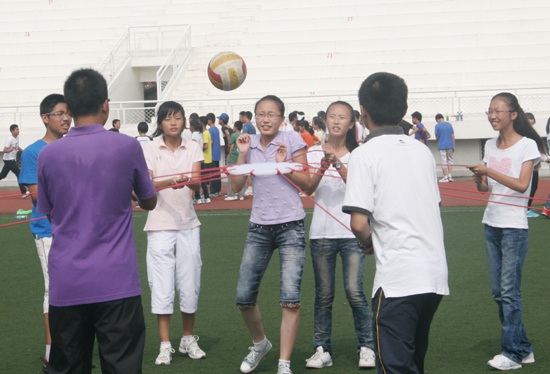 随后,拓展训练营的教练带领同学们来到体育场,分组开展训练活动。继建立组织机构,加强团队建设后,同学们先后参与了沟通类、挑战类等训练项目,“水果蹲”“巧解DNA”“蛟龙出海”“盲人拼画”“多人钻圈”“我们是最棒的”……一系列的游戏活动,让大家在轻松愉快之余增强了合作意识,发展了思维水平。