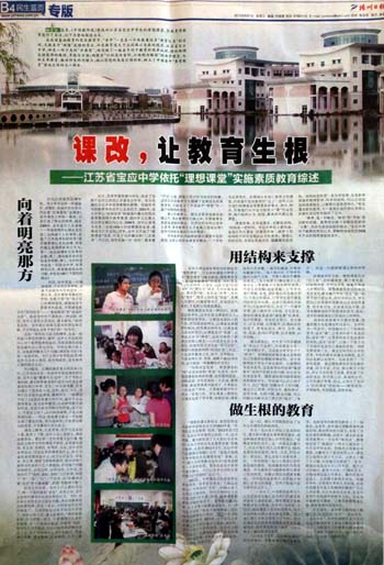 2013年8月7日,《扬州日报》B4“民生蓝页”专栏以彩版的形式全文转载了《中国教师报》对宝应中学的推介文章——《课改,让教育生根》,详细介绍了江苏省宝应中学的课堂教学改革之路。