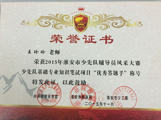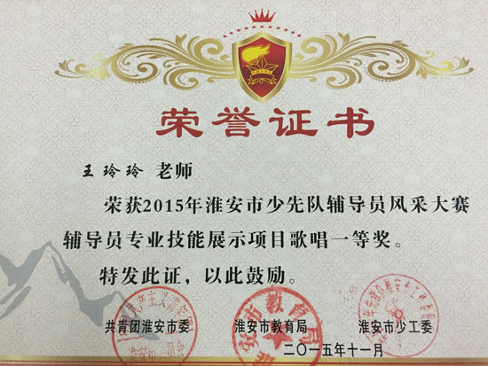 日前,由共青团淮安市委、淮安市教育局、淮安市少工委联合举办的2015年淮安市少先队辅导员风采大赛在市深圳路小学举行,淮安曙光双语学校小学部王玲玲老师与区内兄弟学校五名辅导员组成代表队参赛。经过两天的角逐,淮安区代表队荣获团体一等奖,王玲玲老师获得了专业知识笔试项目“优秀答题手”和专业技能展示项目歌唱一等奖的好成绩。